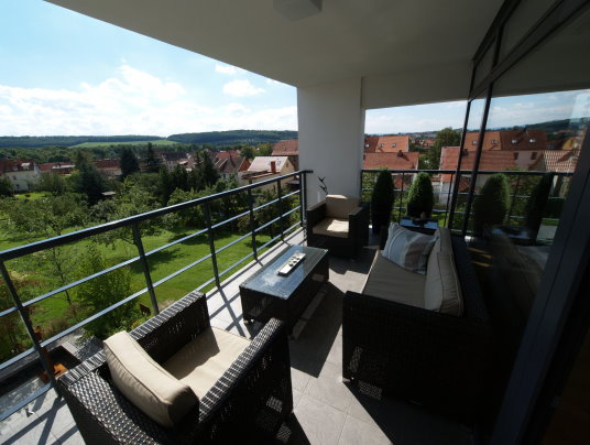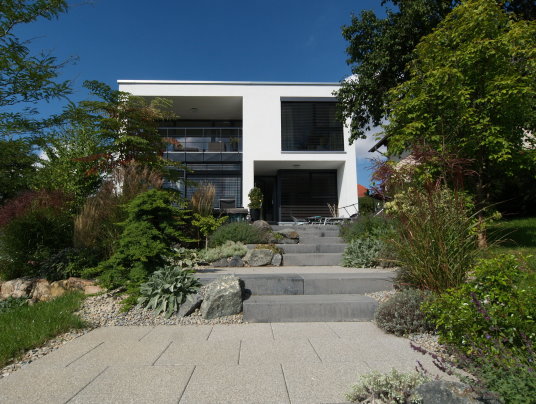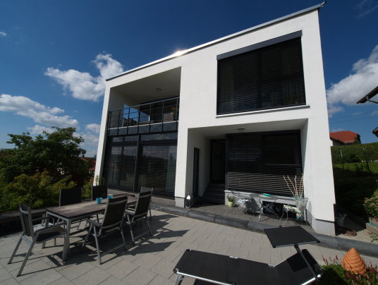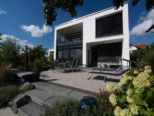To the north towards the street the building appears rather sealed off, whereas to the south it opens up onto the private garden with huge windows. The terrace and the designed garden with selected plants are ideal for unwinding. The loggia on the upper floor offers a wonderful view over parts of the rather rural local area; the nearby Seeberg hill, Friedenstein Palace and the distant Inselsberg mountain also reveal themselves to the observer’s gaze.