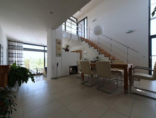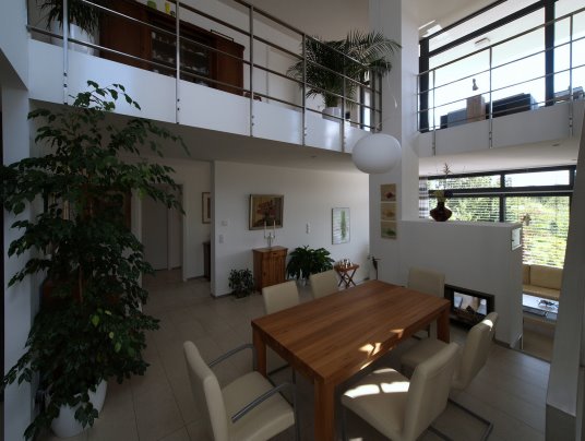 In the interior of the building one comes across spacious areas with a two-storey dining area, library, gallery and separate guest unit.