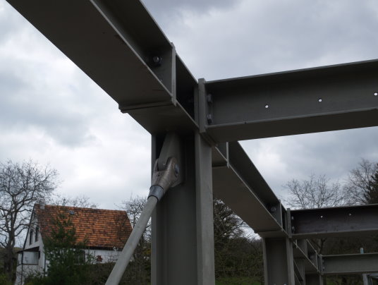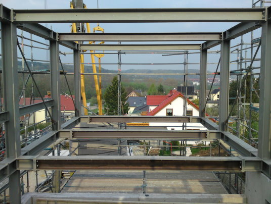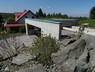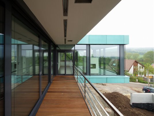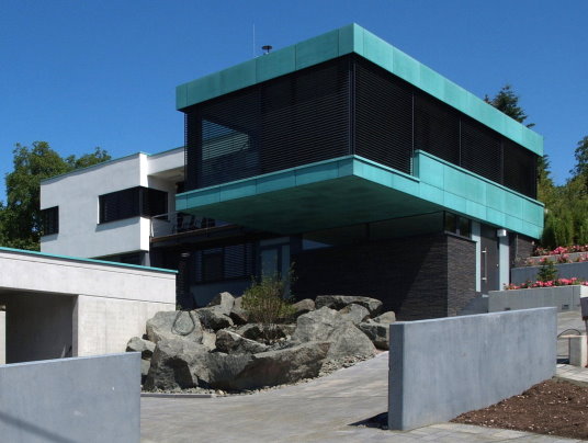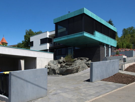 Durch Auflösung in eine Stahlkonstruktion ist den exponierten Bauteilen eine optische Leichtigkeit gegeben worden, die sich auch in der Materialwahl der Fassaden widerspiegelt. Glatte weiße Putzflächen wechseln mit Glasfronten, die in der Landschaft als unaufdringlich empfunden werden. Die Leichtigkeit des schwebenden Obergeschosses wird durch die Wahl der Fassadenbekleidung aus patinierten Kupferkassetten unterstrichen – ein Material, das an alte Kirchendächer erinnert.