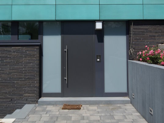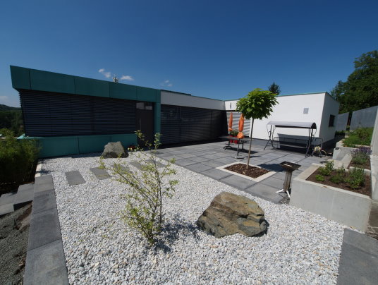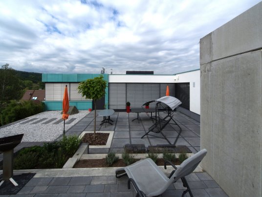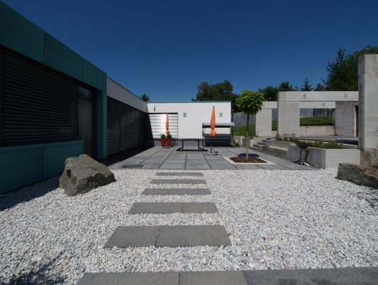 Die Terrasse weitet sich zu einem baulich gefassten Wohnhof aus, der einen sehr privaten Charakter hat und vor Einblicken geschützt ist.