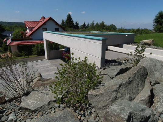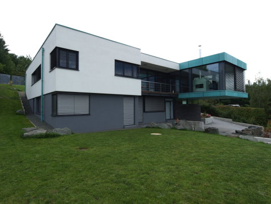 Für das Grundstück mit freiem Blick auf die Wachsenburg bestand die Aufgabe darin, ein Wohnhaus zu entwerfen, das zum einen der exponierten Lage gerecht wird, zum anderen die ausgeprägte Topographie mit einem Höhenunterschied von 10 m berücksichtigt. Damit sich das Wohnhaus nicht zu massig auf der Höhe präsentiert, sind kleinteiligere Baukörper gewählt worden. Möglichst viel Baumasse sollte in den Hang verlagert werden.