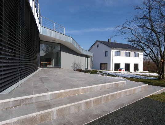 Erdgeschoss und Garage wachsen scheinbar metamorph aus dem Gelände und korrespondieren mit schräg verlaufenden Grundstücksgrenzen und der gegebenen Hanglage.
