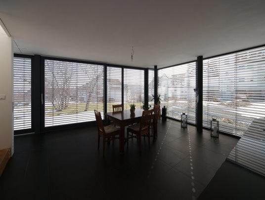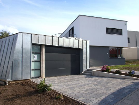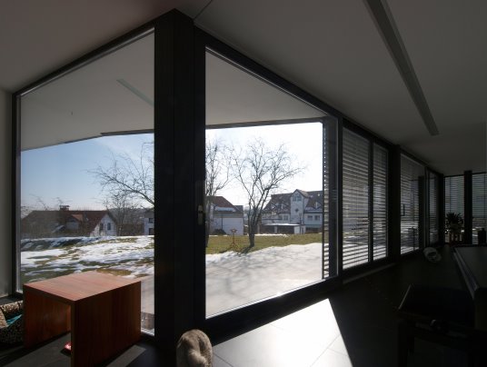 Die interne Raumaufteilung, die Ausrichtung von Wohnhaus und Garage zueinander sowie die Gestaltung der Außenanlagen nehmen Bezug auf diese Blickbeziehung und brechen so mit konventionellen Planungsansätzen.